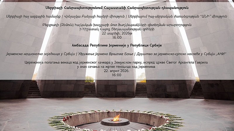 BEOGRAD – Ambasada Republike Jermenije u Republici Srbiji, u saradnji sa Jermenskom nacionalnom zajednicom u Srbiji, Udruženjem Jermena Vrnjačke Banje i Društvom za jermensko-srpsko nasleđe u Srbiji „ANI“, organizuje ceremoniju polaganja venaca u znak sećanja na žrtve genocida nad Jermenima, saopštila je danas Kancelarija Ambasade u Beogradu.